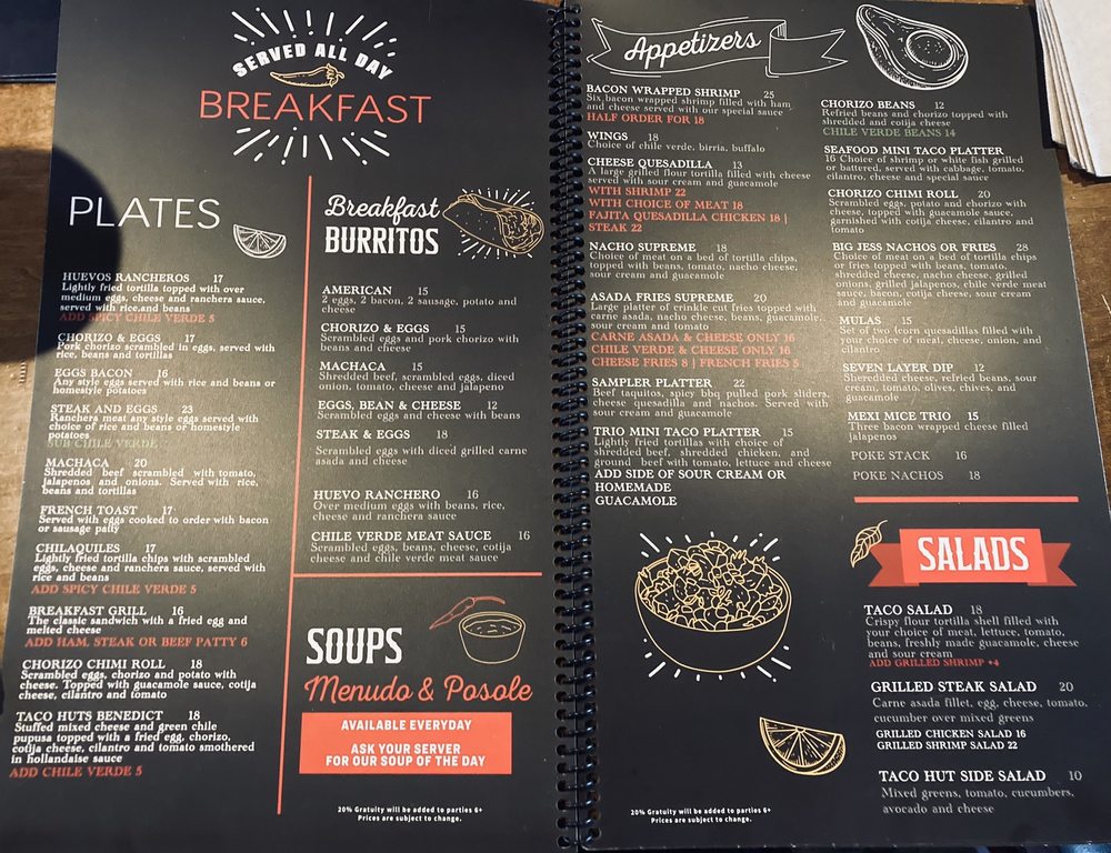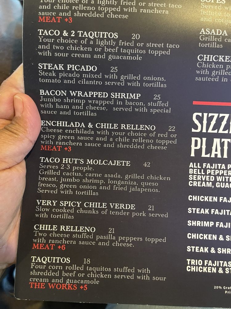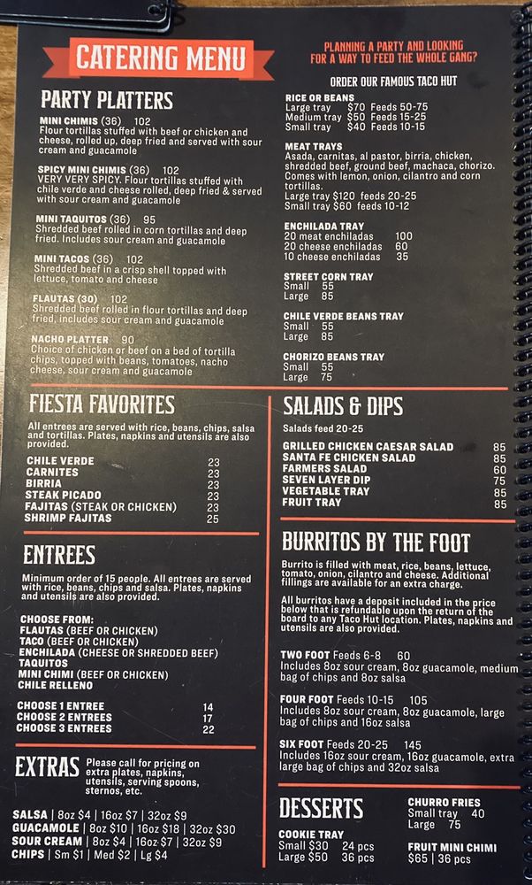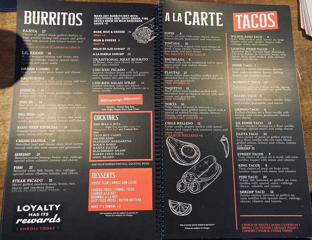 Taco Hut is a casual Mexican restaurant in Rancho Cucamonga, CA, offering a wide range of options for breakfast, lunch, dinner, and dessert. The menu includes traditional dishes like Huevos Rancheros and Chorizo and Eggs for breakfast, along with delicious Breakfast Burritos such as the American Burrito and Machaca Burrito. Customers rave about the quality of their ground beef tacos and flavorful salsa. The restaurant also boasts a full bar with a variety of alcoholic beverages, including margaritas and beers. The welcoming atmosphere, friendly staff, and ample TV screens make it a great spot for gathering with friends or catching up on sports. With happy hour specials and outdoor seating options, Taco Hut is a must-visit for Mexican food enthusiasts looking for a lively dining experience.